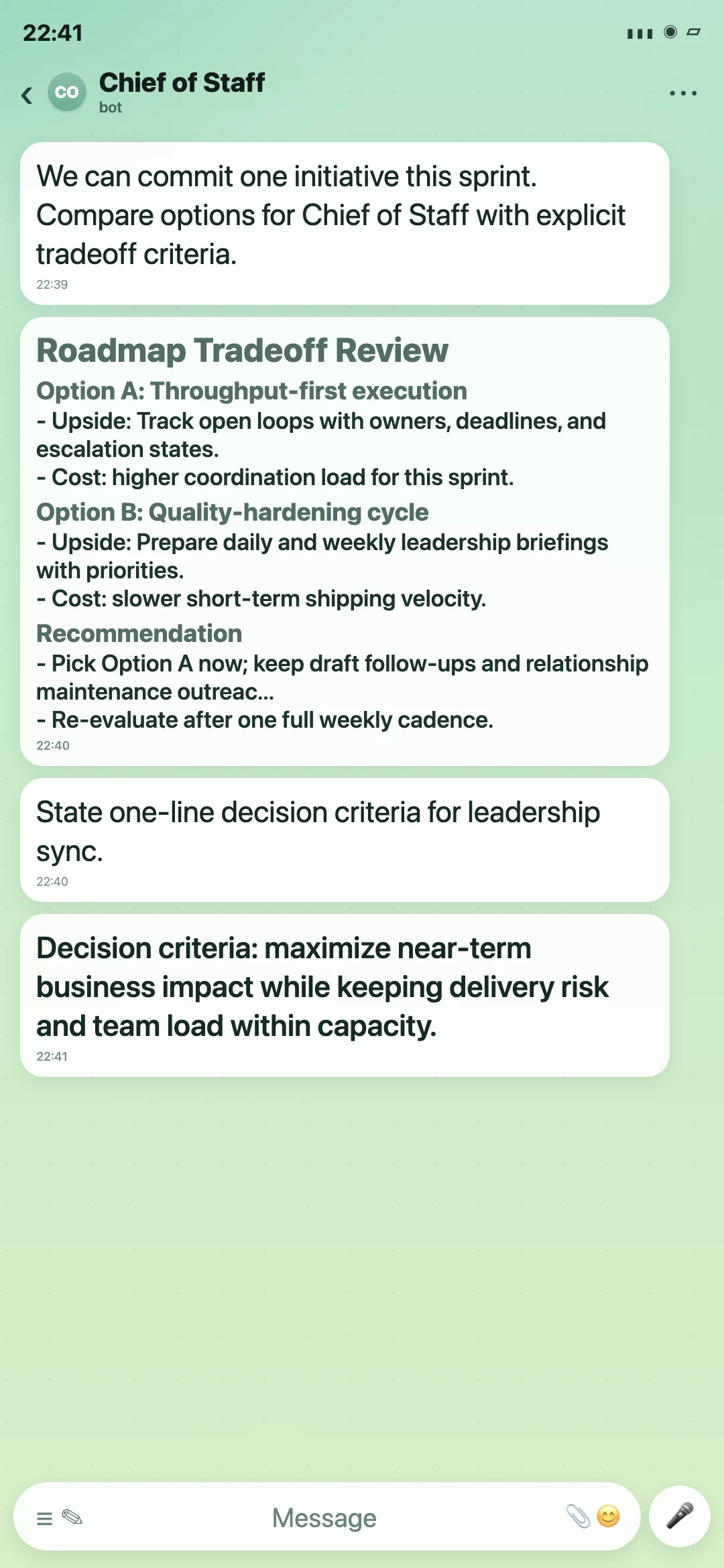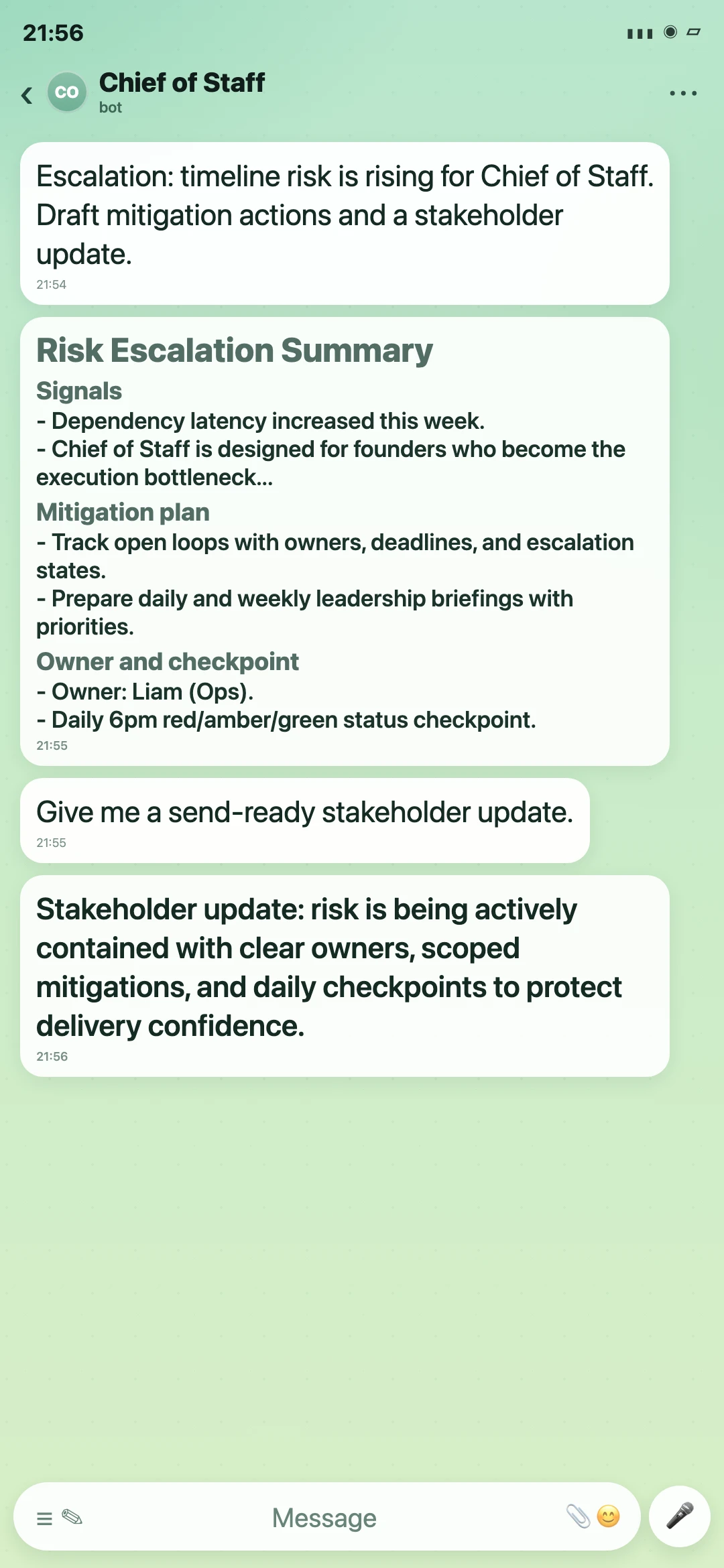 Chief of Staff is designed for founders who become the execution bottleneck. It runs coordination operations around decisions, relationships, and follow-through, so critical work does not get lost in context switching. Use it when leadership cadence feels reactive and fragmented.