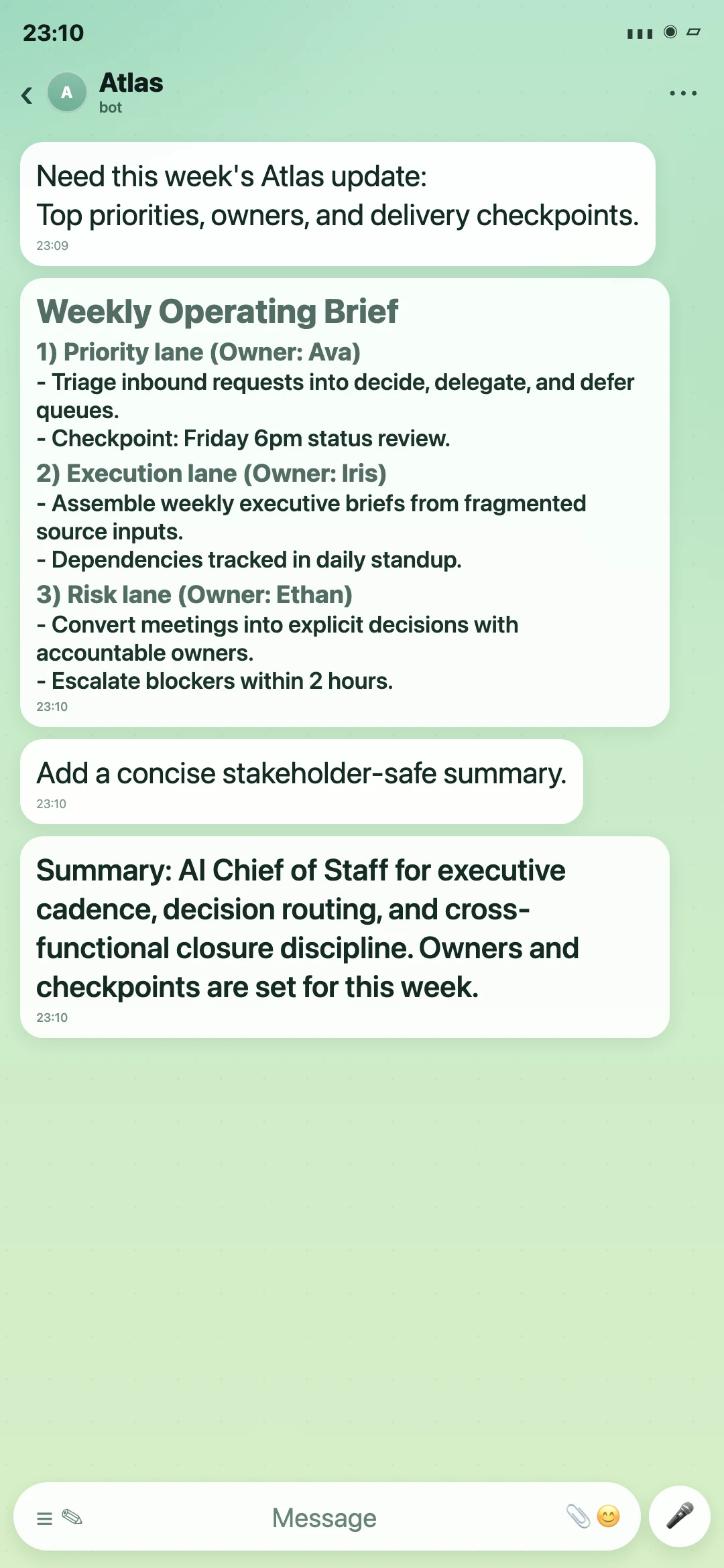 Atlas is an executive operating persona built to reduce reactive leadership overhead. It turns incoming requests into decision-ready queues with ownership and deadlines, then enforces closure across teams. Use it when unresolved decisions are compounding into avoidable escalations.