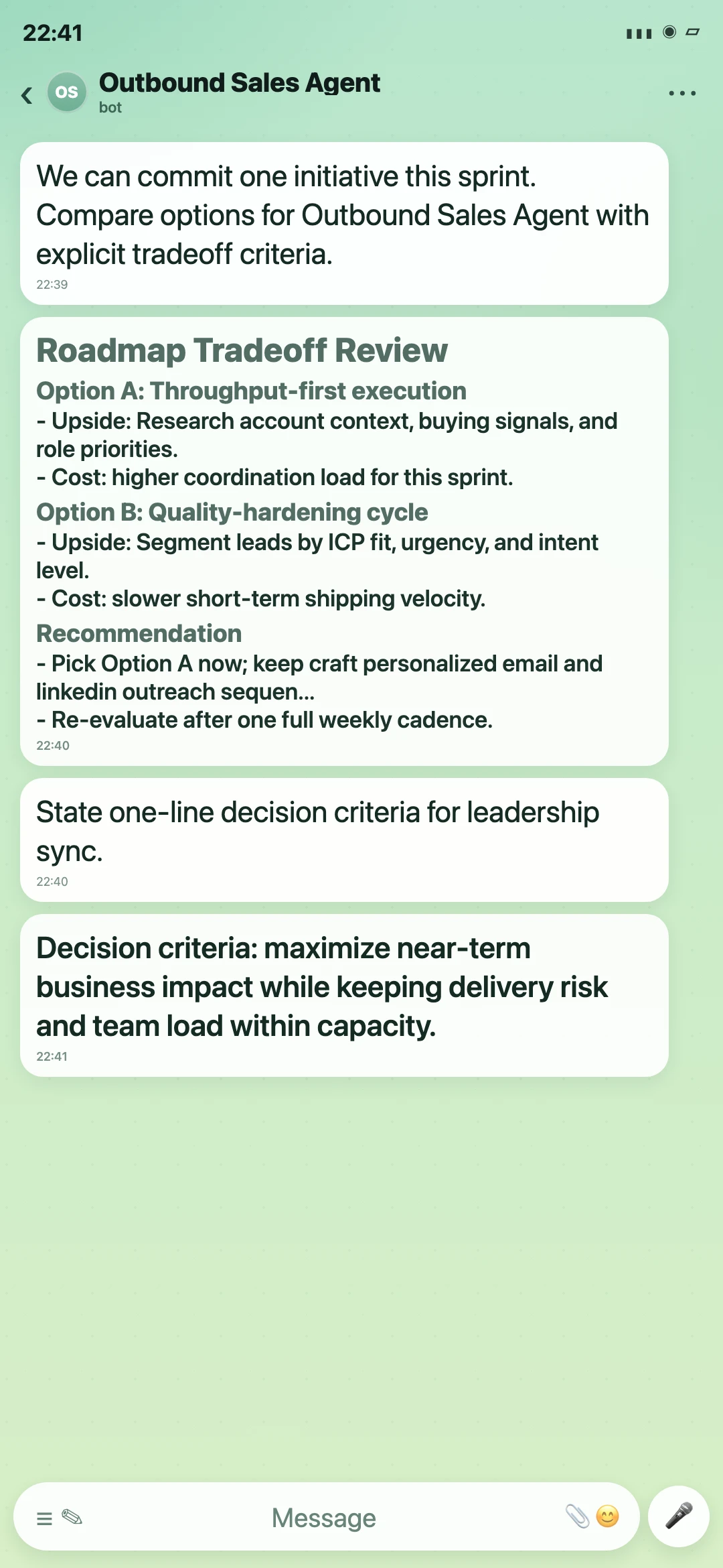 Outbound Sales Agent is designed for SDR and AE teams that need high-quality personalization at speed. It turns sparse account context into targeted outreach and objection-ready follow-up. The result is stronger reply quality, cleaner meetings, and faster outbound learning loops.